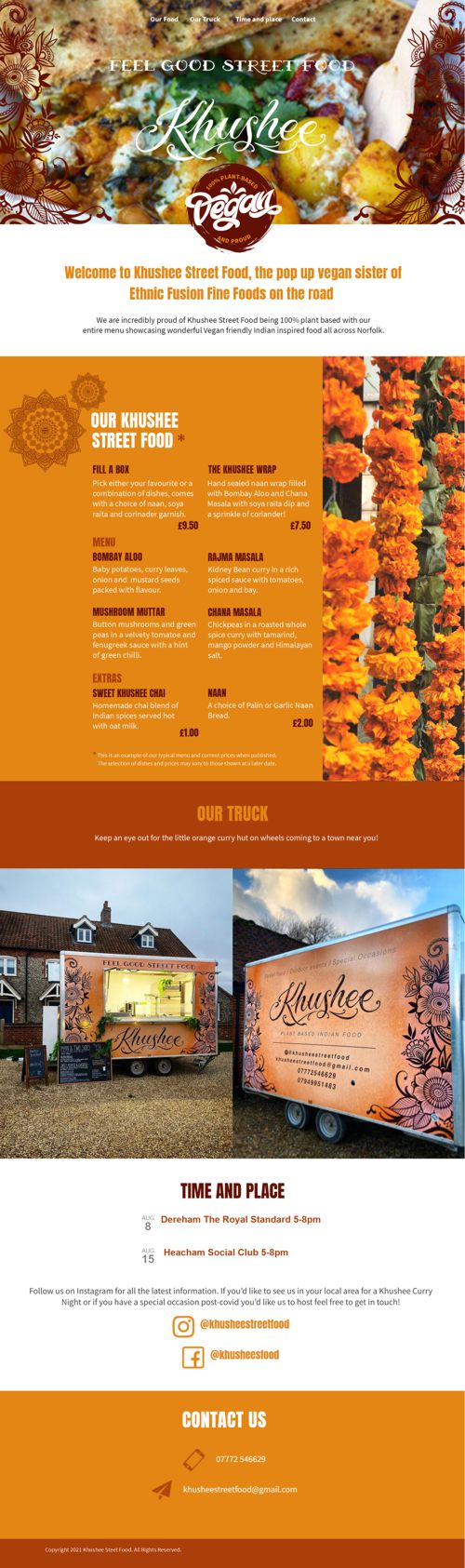 The final one page I designed and built for them website does what it needs to do, and acts as valuable information point for Khushee's existing customers who do not wish to use social media, and any new customers that find them via this route is a bonus in addition to their social media presence. They are also able to update dates and venues themselves for free via a third party website widget that dynamically updates the information on the Khushee website, and ongoing hosting costs have been kept to the minimum.